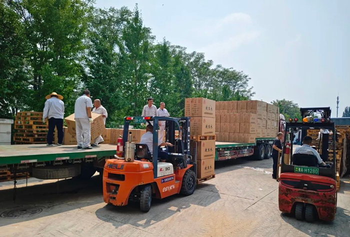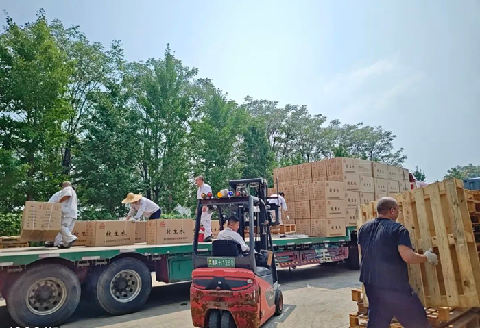 華騰化工立即調(diào)度人力、物力,爭分奪秒組織應(yīng)急物資配送。歷經(jīng)5個多小時(shí)不間歇備貨、裝載,滿載應(yīng)急物資的4輛大貨車陸續(xù)發(fā)車,前往抗汛一線。