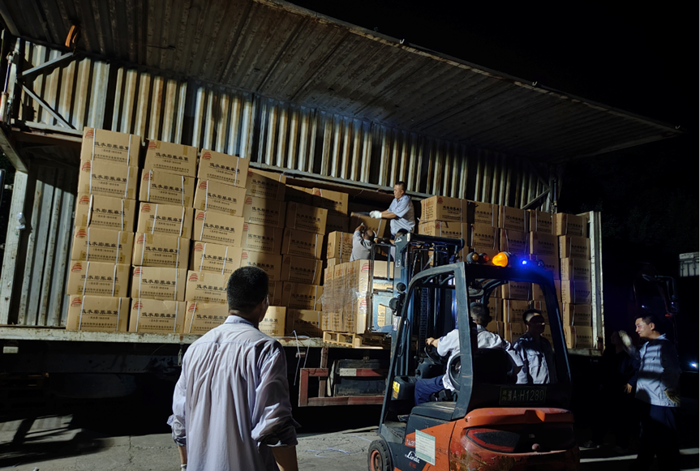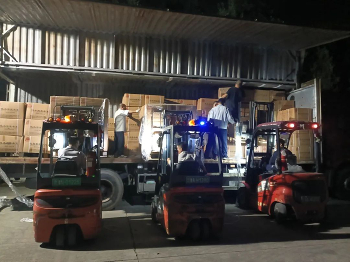 剛剛出庫完畢,還沒等干部職工歇歇腳,17時(shí)左右,市應(yīng)急局再次發(fā)來指令,追加雨衣3700套,華騰化工迅速調(diào)度第5輛專用車輛進(jìn)行物資裝車,干部職工也馬不停蹄地投入到裝載工作中。正在酣戰(zhàn)之時(shí),18時(shí)許,市應(yīng)急局第三道指令接踵而至,追加18000條編織袋和32000條吸水膨脹麻袋。華騰化工再次緊急調(diào)度第6、7輛專用車輛,現(xiàn)場干部職工發(fā)揚(yáng)連續(xù)作戰(zhàn)精神,在3小時(shí)內(nèi)完成全部應(yīng)急物資的裝車、發(fā)貨任務(wù)。