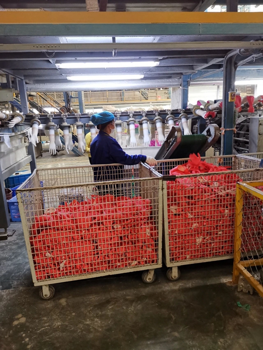 隨著各地區復工復產的推進,以及“外防輸入”和“社區疫情防控”力度的不斷加大,工業領域疫情防控、普通居民的居家防控對專業防護手套的需求急劇增加。為全面履行國企社會責任,華騰橡塑在重點保供醫用手套的前提下,努力克服京內、京外雙線生產的各種困難,全力保障工業用和家用防護手套市場供應。日前,京內已投產2條生產線,京外已投產5條生產線,均滿負荷運行。