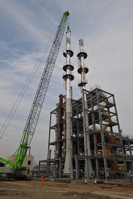 兩座精餾塔中的單體精餾單元,高達(dá)48米,是PAE(聚芳醚)項(xiàng)目最高裝置。為高質(zhì)量完成吊裝任務(wù),京騰昊樺干部職工統(tǒng)一協(xié)調(diào),相繼完成了基礎(chǔ)復(fù)核、標(biāo)高復(fù)核、吊裝位置復(fù)核等前期工作,并同步完成保溫層、爬梯和平臺的安裝。