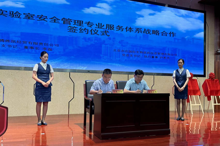 6月27日下午,亦莊醫(yī)藥產(chǎn)業(yè)園危化品統(tǒng)一配送服務(wù)平臺、科研實(shí)驗(yàn)室安全生產(chǎn)教育培訓(xùn)學(xué)院揭牌儀式舉行,北京亦莊國際生物醫(yī)藥投資管理有限公司黨委書記尹希杰,華騰化工黨總支書記、董事長李磊代表雙方簽署了戰(zhàn)略合作協(xié)議,經(jīng)開區(qū)城市運(yùn)行局相關(guān)領(lǐng)導(dǎo),醫(yī)藥園相關(guān)單位,華騰化工、華騰旌凱相關(guān)領(lǐng)導(dǎo)出席簽約和揭牌儀式,近百人參加。